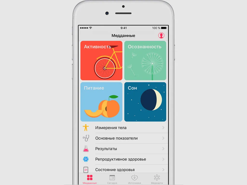 В смартфоны Apple встроены полезные приложения к примеру, приложение «Здоровье». В нём можно хранить все важные данные о медицинском состоянии пользователя. К примеру, можно внести информацию о принимаемых лекарствах и группе крови. Если человек потеряет создание, информация о состоянии здоровья поможет спасти ему жизнь. Приложение можно интегрировать с Apple Watch, чтобы отслеживать ЧСС и ЭКГ. Эти данные применяются для повышения качества тренировок и безопасности физической активности.